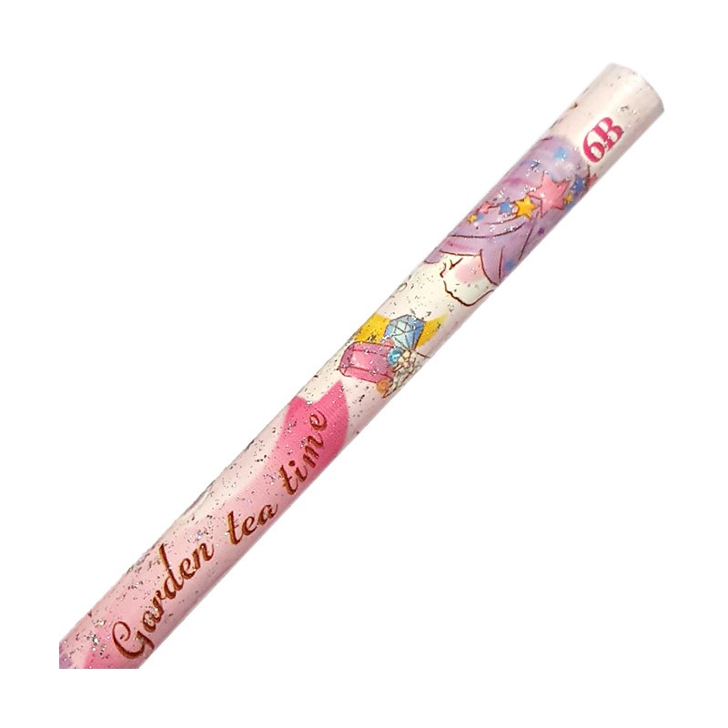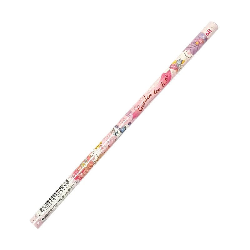 Graphite 6B round pencil with super cute illustration of Garden Tea Time collection in pink and white tones. Pencil sprinkled with glitter and lilac pencil top with metallic pink star detail.
