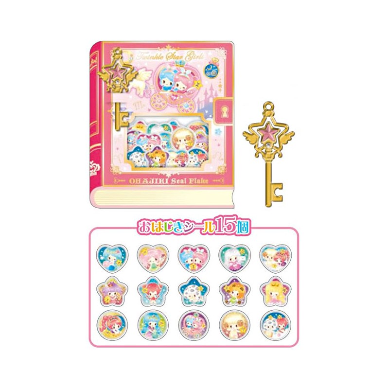Set de apliques super fofos com ilustrações holográficas das adoráveis meninas Twinkle Star. Inclui ainda um pendente dourado em forma de chave perfeito para pendurar em telemóveis, argolas para porta-chaves, malas ou bolsas.